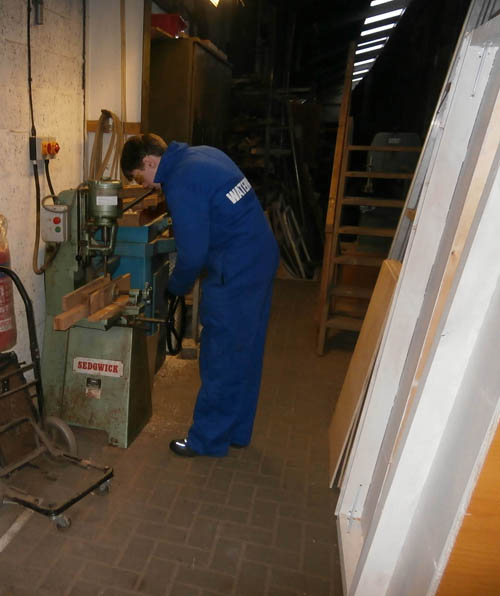 partitions. The main panels are now all in place, only the edge mouldings left to do. Bob Mowat is seen (left) applying intumescent