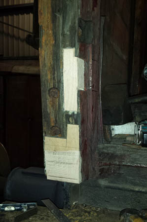 While Robbie was working on the SW pillar, Don was repairing the NW one with a large piece of beech (see below)
