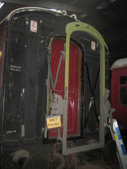 was taken while the bellows were off to clean, primer, undercoat and topcoat the ironwork of the gangway