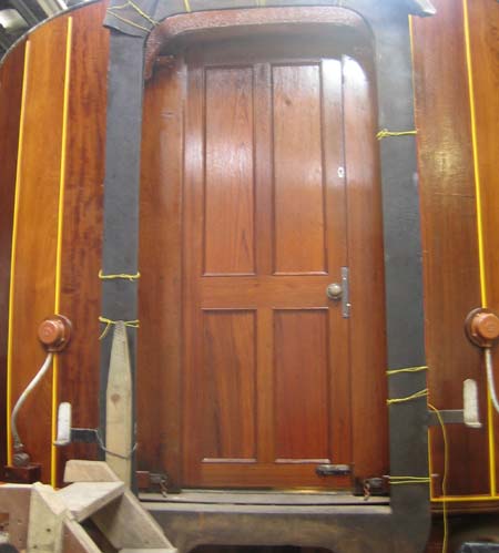 Alan Wilson has reassembled the furniture on the east gangway door and this has now been hung. Similar work proceeds with the west door. The corridor saloon door has had its shiny new 3-bar handle and mortice latch fitted - this seems to function OK. Vestibule saloon door followed the next week.